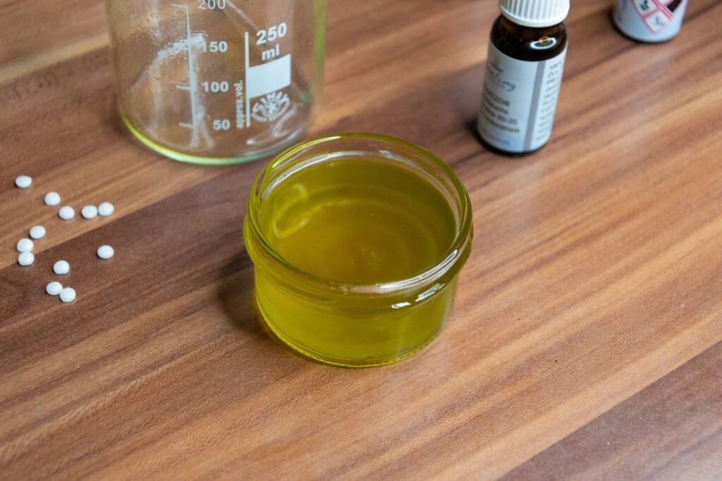 - Gib das Olibond bzw. das Bienenwachs gemeinsam mit dem Ölauszug in ein Becherglas und stelle es gemeinsam ins Wasserbad.