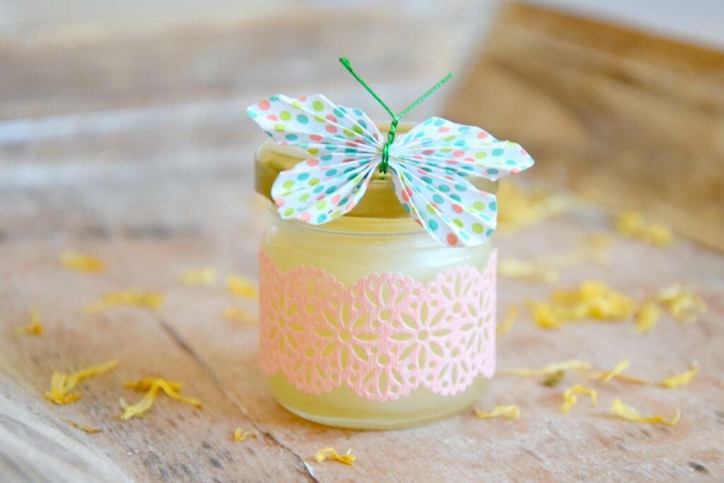 Ich habe eine einfache Bordüre und einen kleinen Schmetterling auf den Balsam geklebt und schwupps sieht er frühlingshaft und süß aus.
