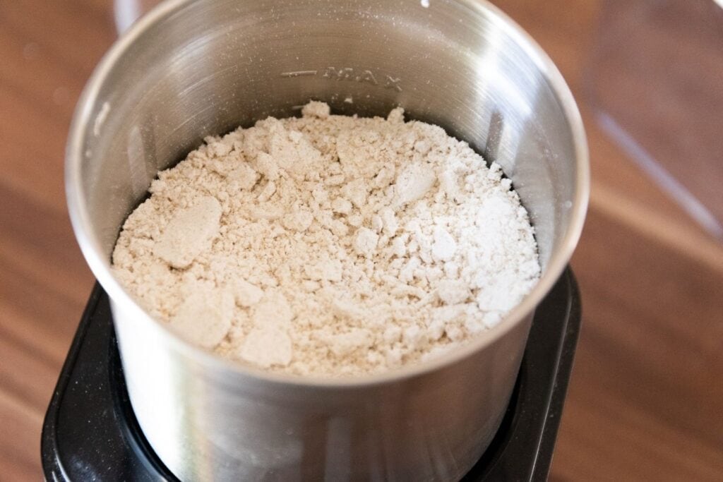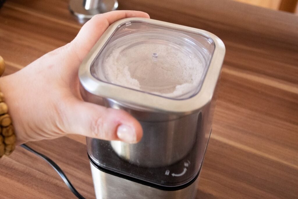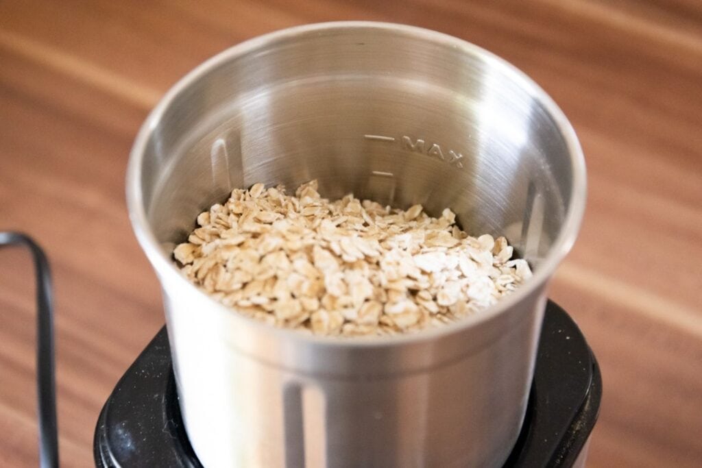 Dazu gibst du die Haferflocken in deine Mühle. Wenn du wie ich eine elektrische Mühle verwendest, mahlst du am besten pulsierend, also nicht im Dauerbetrieb, sondern dazwischen immer wieder eine kleine Pause machen. So überhitzt der Motor nicht.