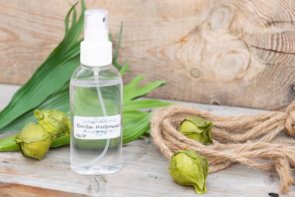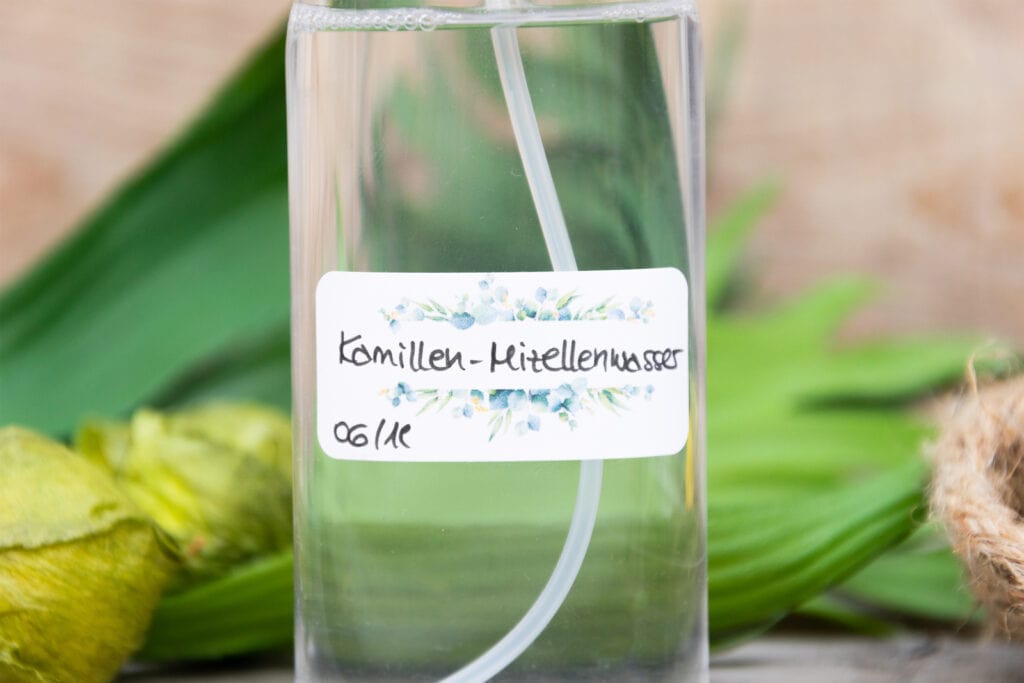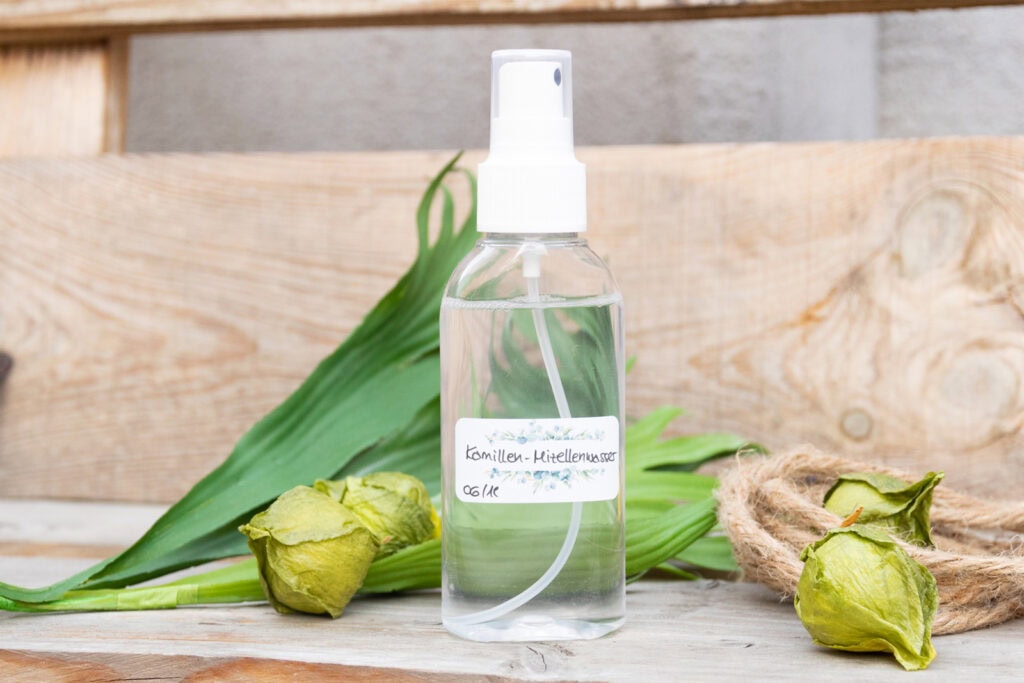 Hinweis: Verwendest du statt des Alkohols zur Konservierung ein Konservierungsmittel wie zum Beispiel Dermosoft 1388 Eco, so benötigst du 1,75 g vom Konservierungsmittel (=3,5%ige Konservierung) und 44,25 g Kamillenhydrolat (statt 37,75 g). Bitte pH-Wert lt. Herstellerangaben beachten.