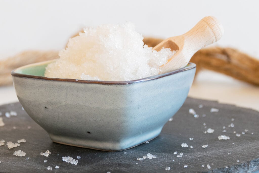 Für das Nase frei-Badesalz gibst du das Meersalz in eine kleine Schüssel und vermengst es mit dem Basisöl.