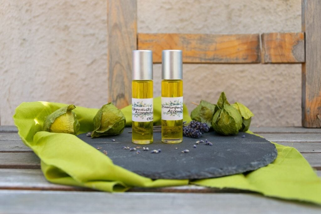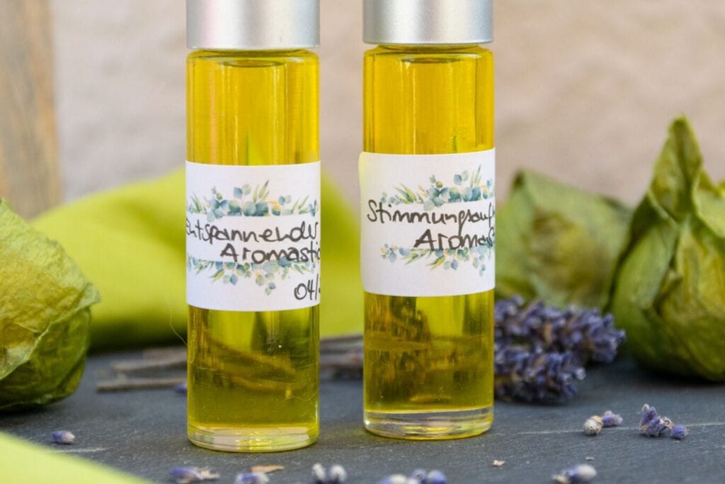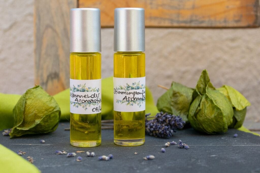 Ich persönlich greife bei meinen Mischungen gerne zu zwei verschiedenen Ölen, wobei das eine ätherische Öl meine Basis bildet und das andere den Duft.