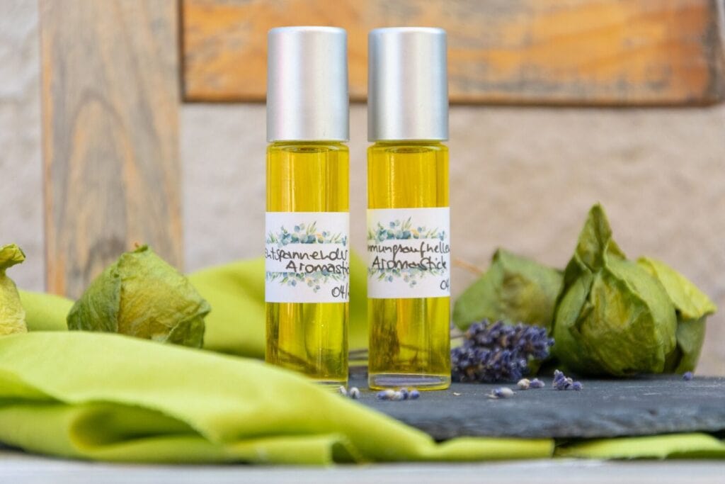 Ein Aromastick ist nichts anderes als ein leerer RollOn-Behälter gefüllt mit einem Basisöl und ergänzt mit ätherischen Ölen für den Duft.