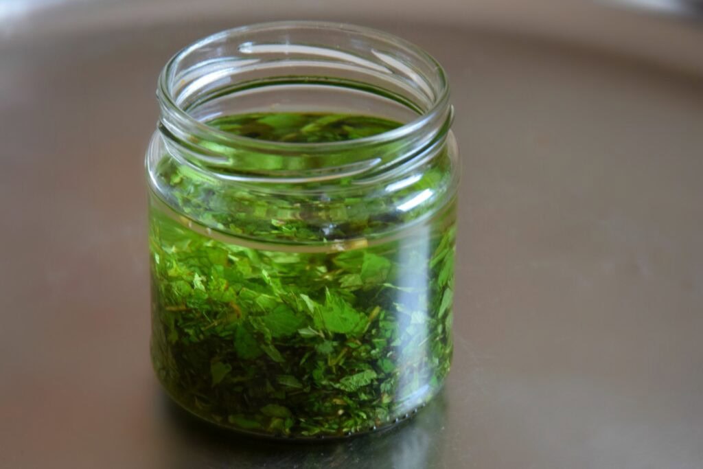Verwende einen guten, naturtrüben und unpasteurisierten Bio-Apfelessig und gieße 1 Teil zerkleinertes Kraut oder Blüten mit 2 Teilen Essig auf. 1 Woche bei Raumtemperatur stehen lassen, danach abseihen und wie gewünscht verwenden.